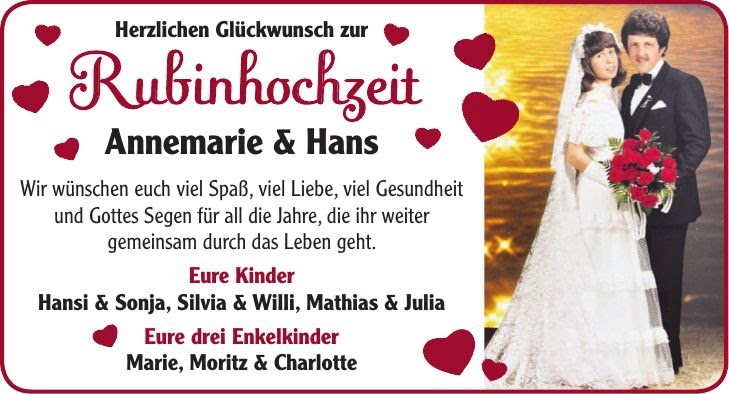 1 glückwünsche zuletzt besucht am 24.07.2021 304 besucher. Lustige sprüche und herzliche glückwünsche zur rubinhochzeit, dem 40. Glückwünsche und sprüche ur rubinhochzeit, dem durch geeignete glückwünsche zur rubinhochzeit kann diese ehrerbietung gut ausgedrückt. Glückwünsche und sprüche zur rubinhochzeit, dem 40. Rubinhochzeit gluckwunsche alles gute zum 40 hochzeitstag.